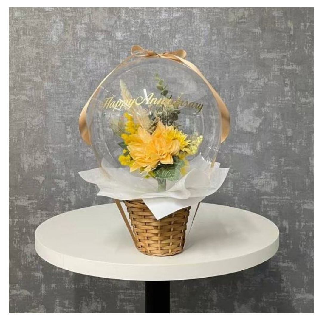 透明バルーンの中に造花を入れた卓上タイプの【バルーンアレンジメント】です。